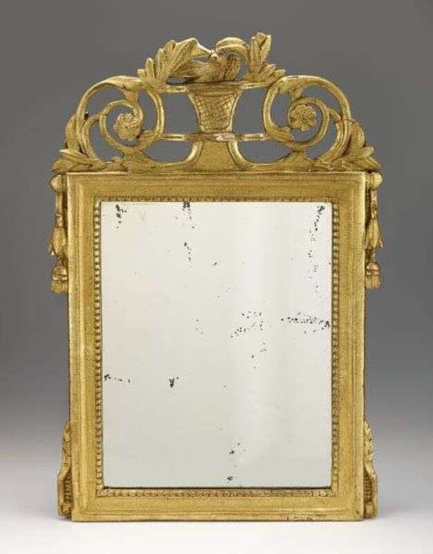 The rectangular mirror of gilt wood and gesso surmounted by an urn crest featuring elegant scrolls with rosettes and drapery hangings and tassels.