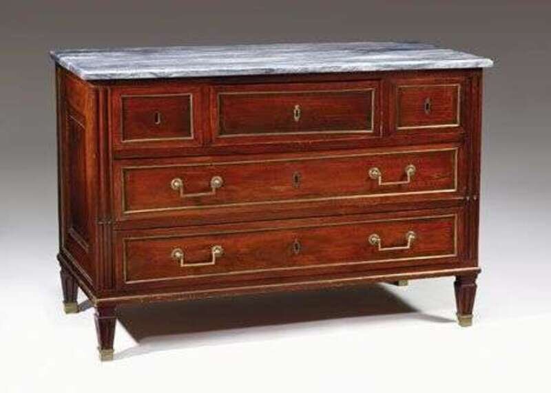 The rectangular grey marble top above three short drawers and two long drawers flanked by fluted stiles raised on square tapered fluted feet.