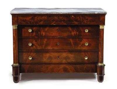 The rectangular grey marble top above a frieze drawer and three long drawers flanked by columns with gilt metal cappings, raised on round turned feet.