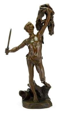 Bronze, medium brown patina, modeled as a nude classical figure holding a pelt in his right hand a sword at the ready in his right, with 'Suisse Freres' foundry mark and signed 'Lanson Sculpt'.