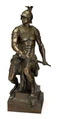 Bronze, medium brown patina, modeled as a seated Roman soldier, his sword at the ready, inscribed 'E. Picault Scup. / Salon des Beauz Arts'.