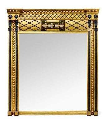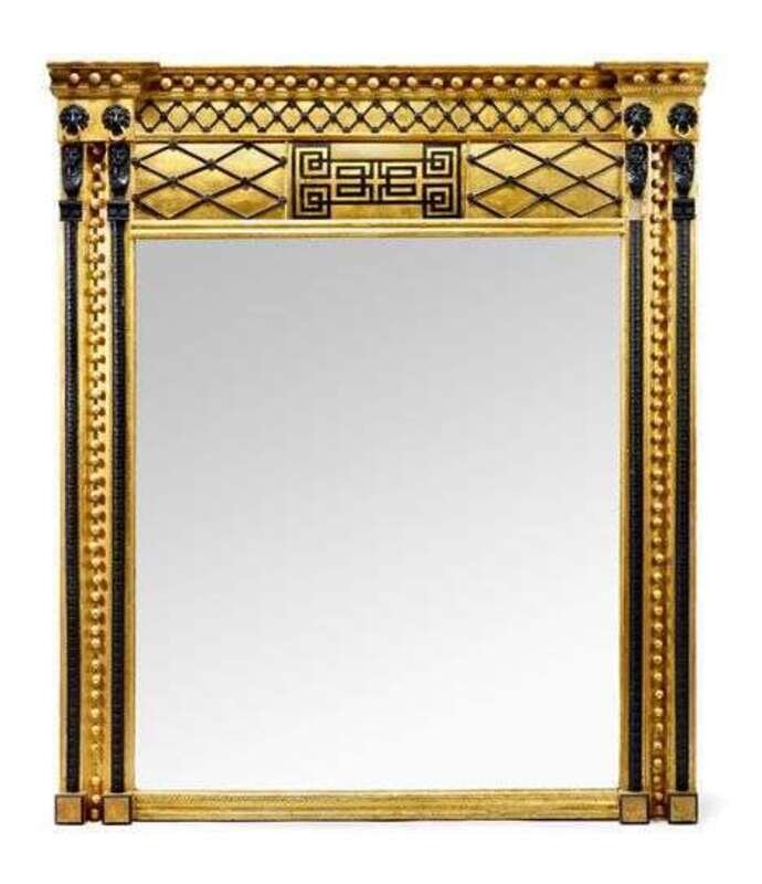 The rectangular mirror plate surmounted by molded trellis frieze centered by a greek key design surrounded by a ball border and flanked by lion ring handles and female terms.