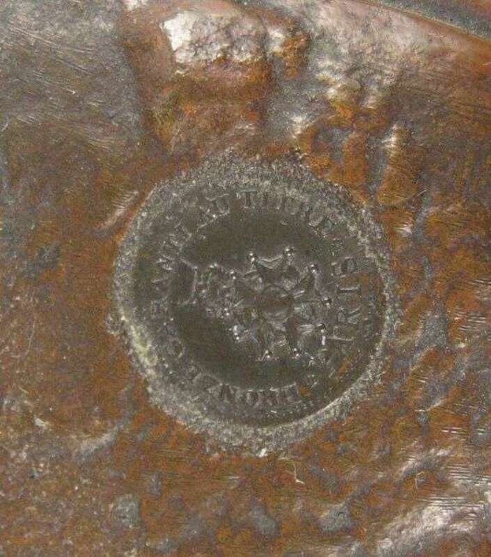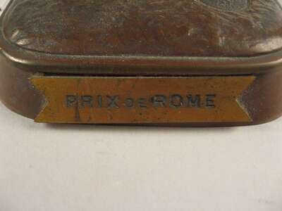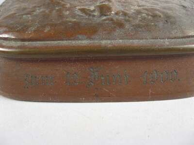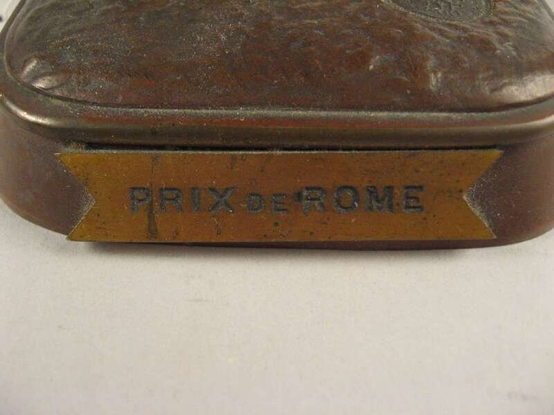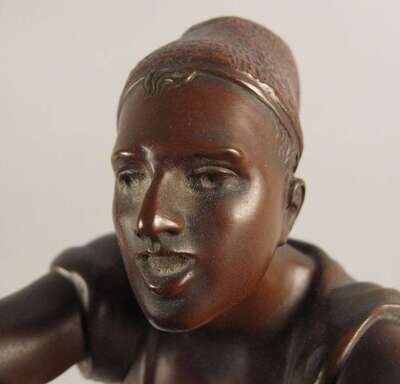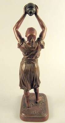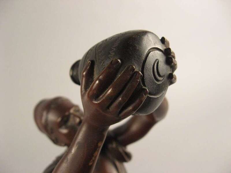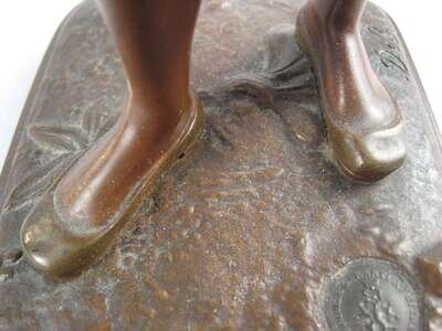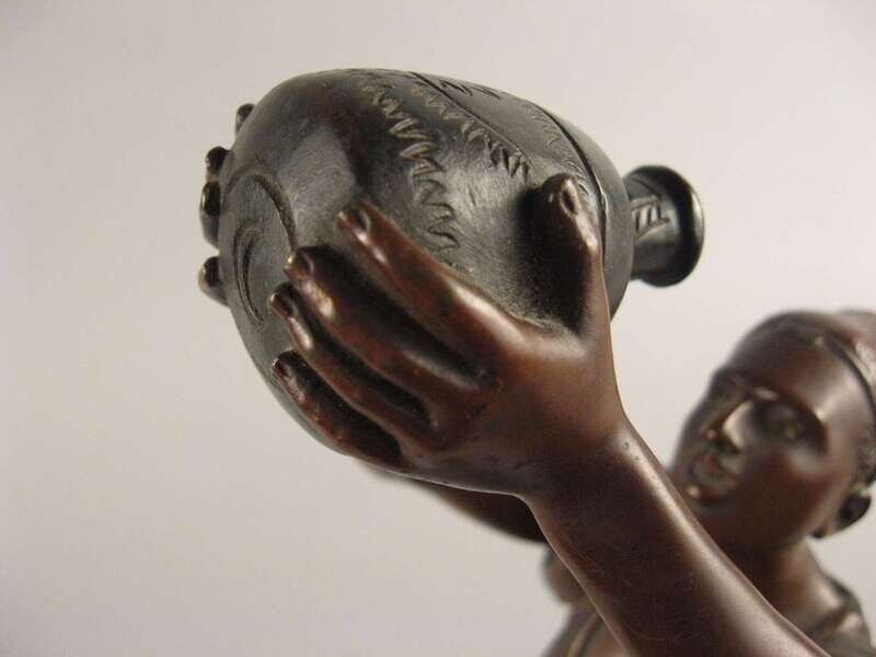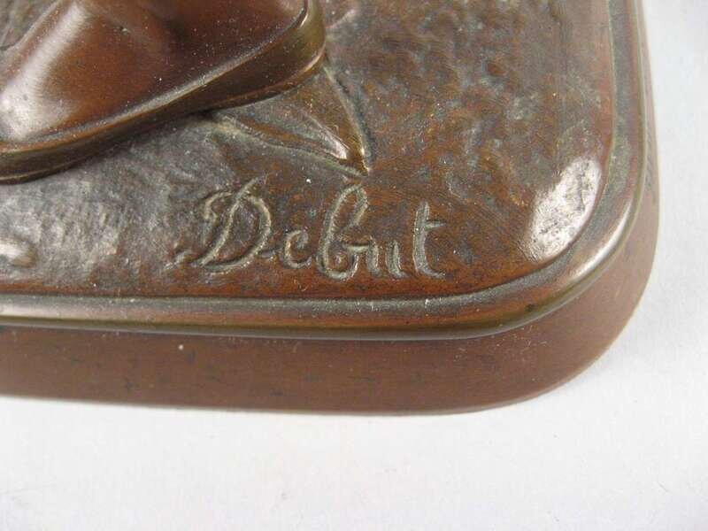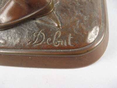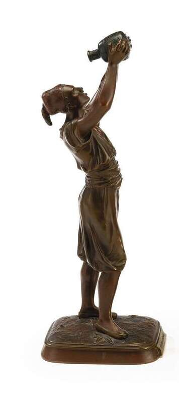 Bronze, red and brown patinas, modeled as a North African pouring a jug over his head, signed 'Debut' with plaque inscribed 'Prix de Rome.', marked with French foundry seal and inscribed and dated 'zum 12 Juni 1900' to the reverse.