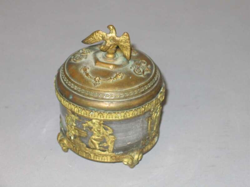 The cover with an eagle finial and cast with classical motifs, over a cylindrical glass inkpot applied with gilt metal overlay depicting classical scenes, raised on rams' head feet.