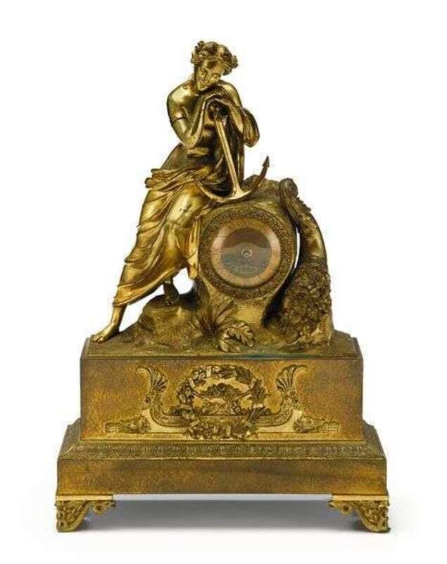 The engine turned dial with Roman numerals, surmounted by a seated women in classical dress resting on an anchor, on a rectangular base with applied flowering basket and scroll motif, raised on bracket feet chased with serpents.