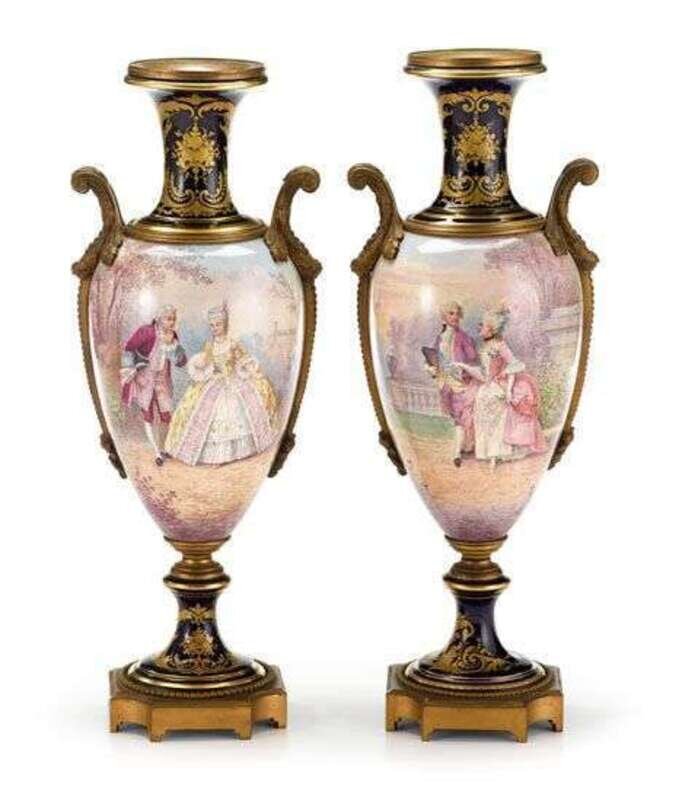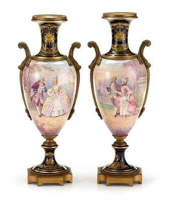 Pair of Sevres style cobalt porcelain and gilt bronze mounted urns late 19th/ early 20th century