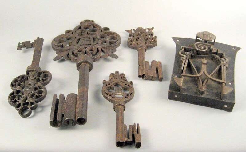 Each with scrolled decoration; together with a rectangular lock plate with animal head decoration. (5).