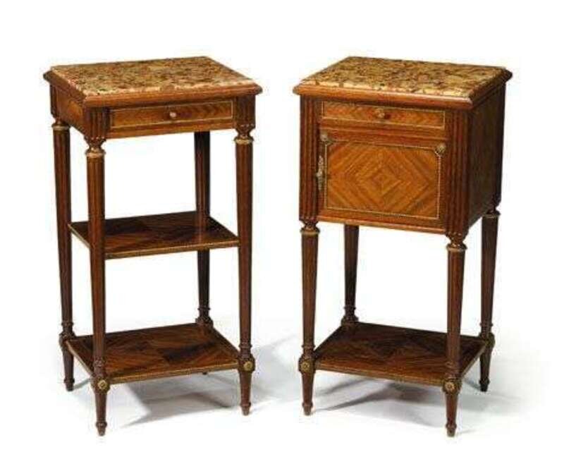 Each with an inset breche d'alep marble top; one with a single drawer and lower platform tier; the other with a single drawer over a cupboard door raised on round turned tapered legs; each with a 'F. Linke' plaque to drawer interior. (2).