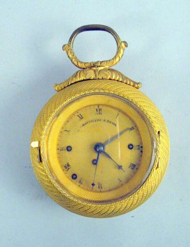 Of pocket watch form, the gilt engine turned face with Roman numerals and four winding aperatures, laurel leaf cast front and reverse bezels, spring strike, with a leaf cast loop handle.
