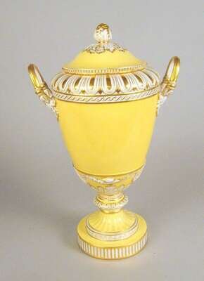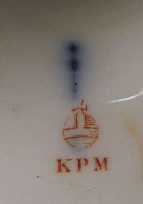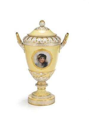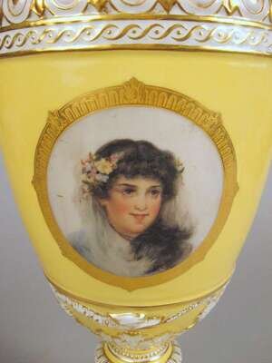 The tapered body centered by a circular reserve painted with a portrait of a dark-haired young woman, with molded classical bands to the shoulder and base, mounted on a circular socle, the cover with a berry finial, underglaze blue sceptre and printed KPM marks.