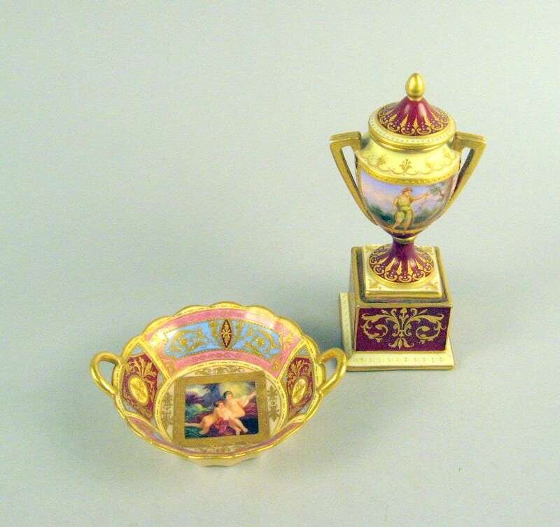 Comprising an urn-on-stand and a small dish, both painted with scenes of semi-nude draped ladies, blue shield mark. (2).