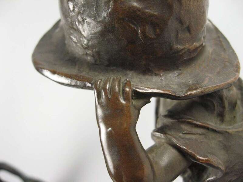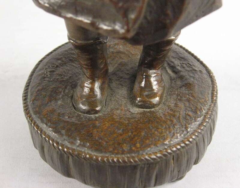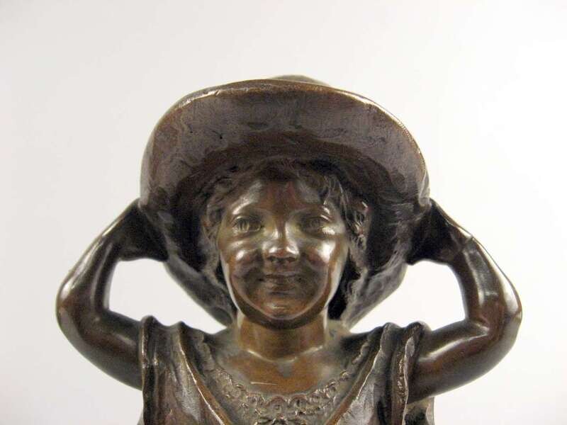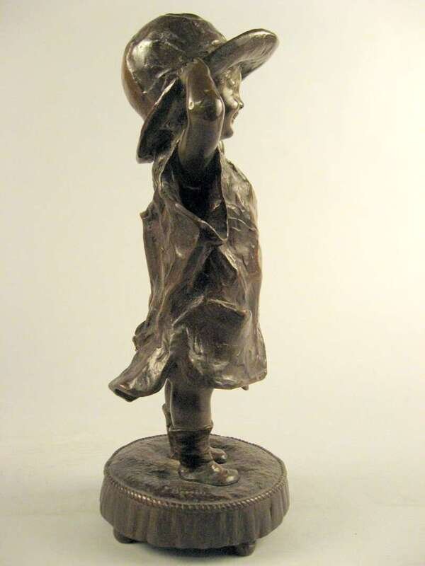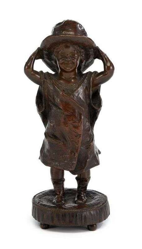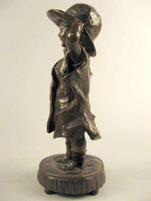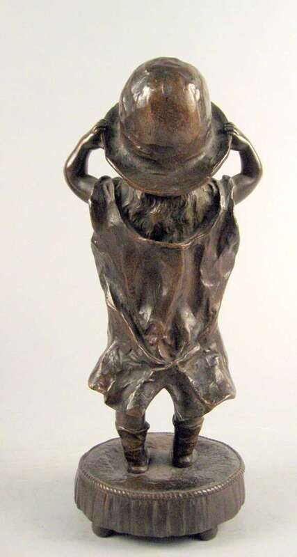 Bronze, medium brown patina, modeled as a little girl wearing her father's waistcoat and hat, signed 'Bessin'.
