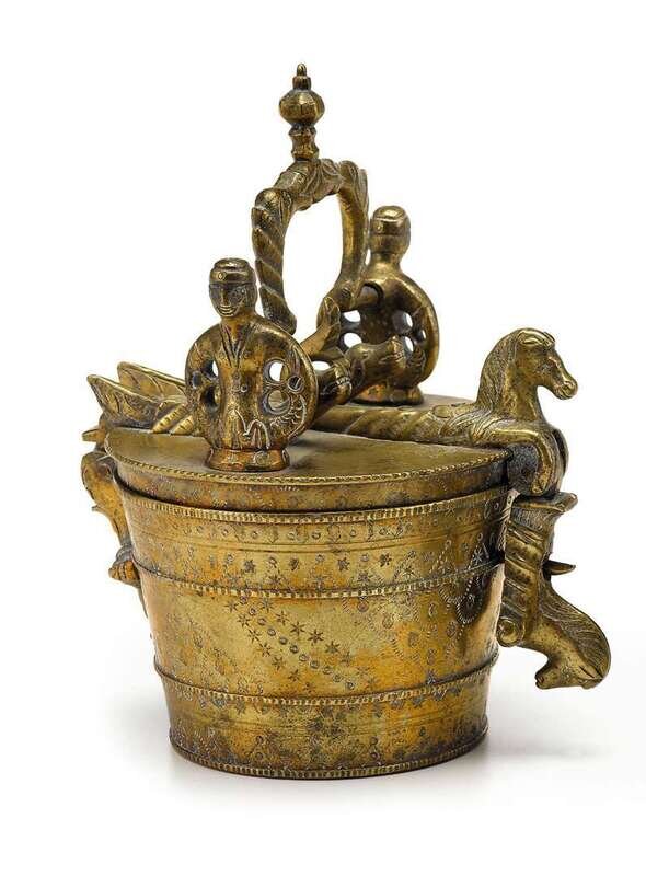 The hinged lid with master's mark of a mermaid, cast with figures of hippocamps and sea lions, the sea serpent handle held by figural supports, the exterior with punched geometric motifs.