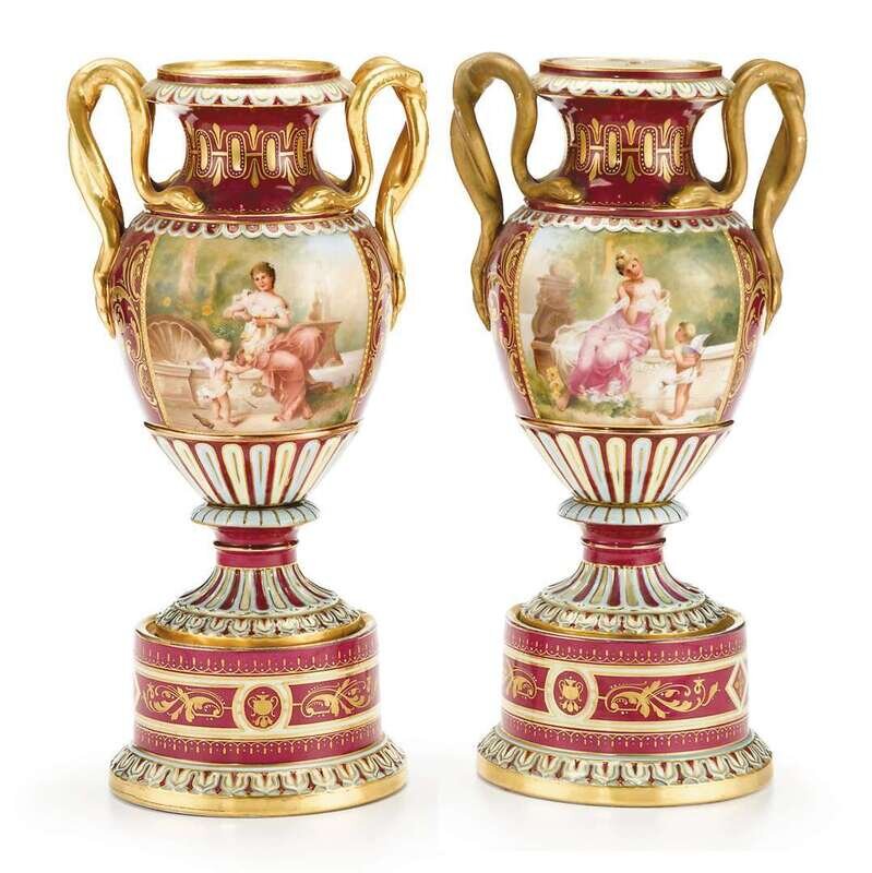 Each baluster form painted with a scene of a young lady approached by Cupid against a wine-red ground, with gilt entwined snake handles and raised gilt details, on a circular column base, blue shield mark. (2).