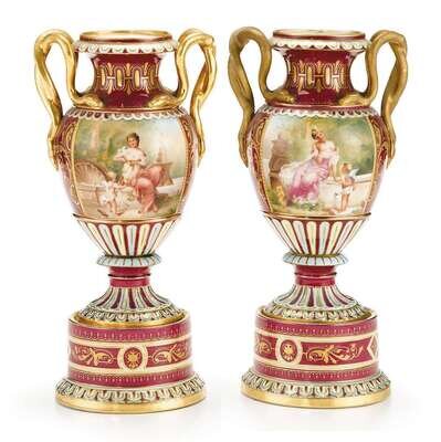 Pair of Royal Vienna porcelain urns on stand late 19th century