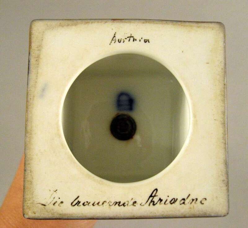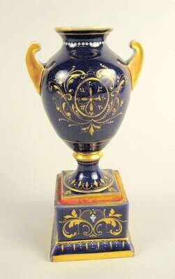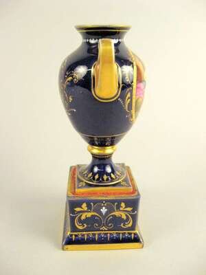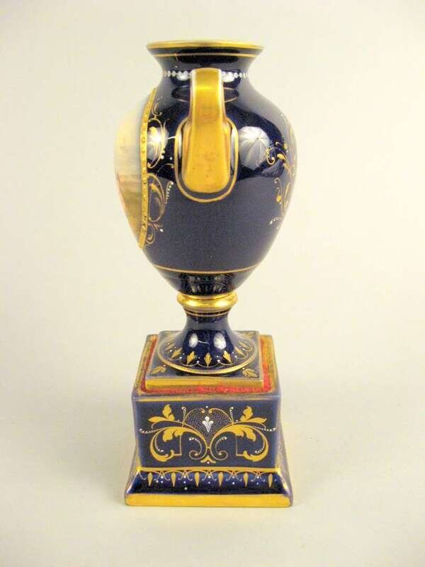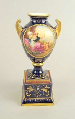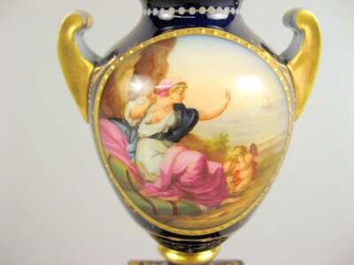 The cobalt urn with a painted reserve depicting Ariadne and a weeping Cupid, on a squared base, with gilt and white details, blue shield mark.
