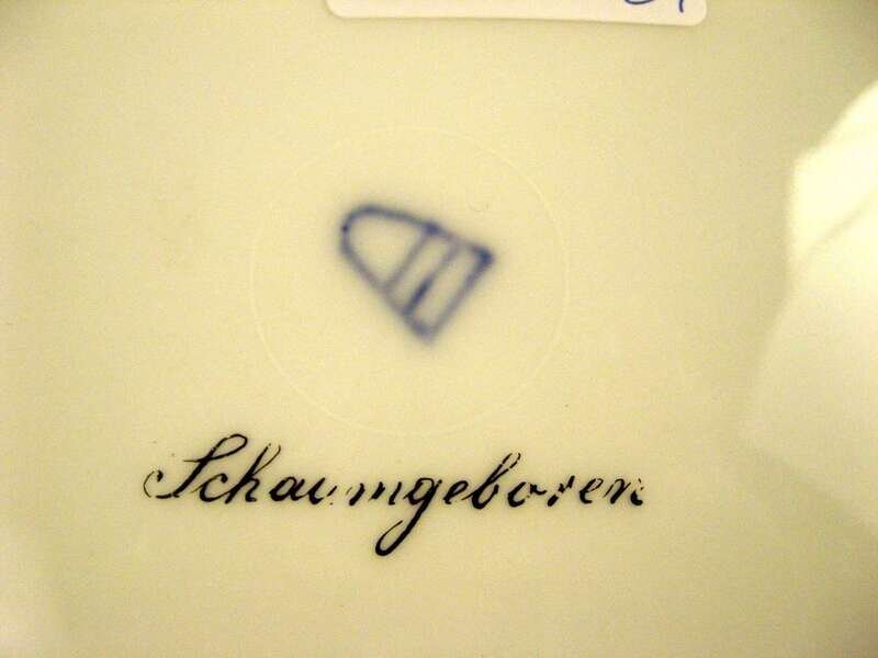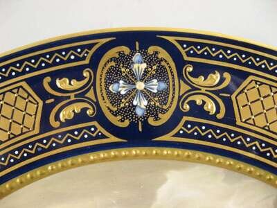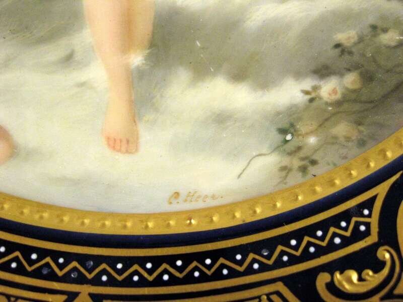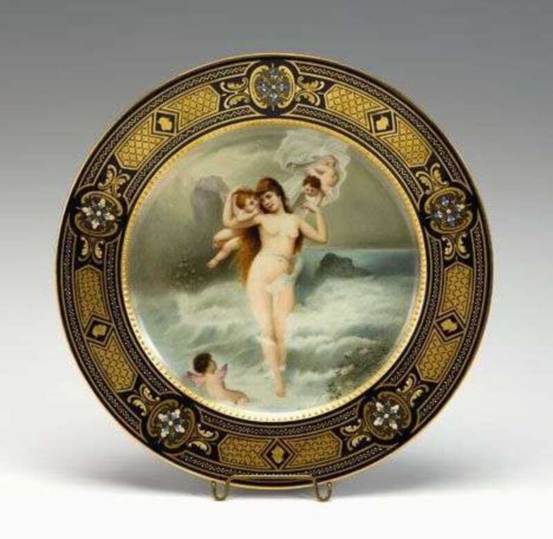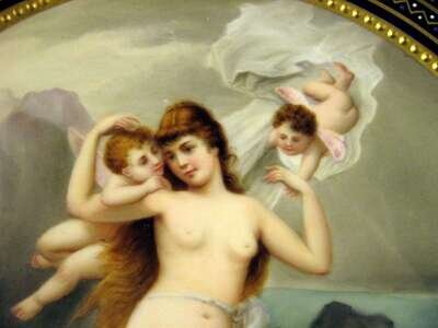 Painted with a semi-nude beauty emerging from the waves and borne aloft by winged putti, in a cobalt, enameled and raised gilt border, blue shield mark and inscription to the reverse.