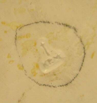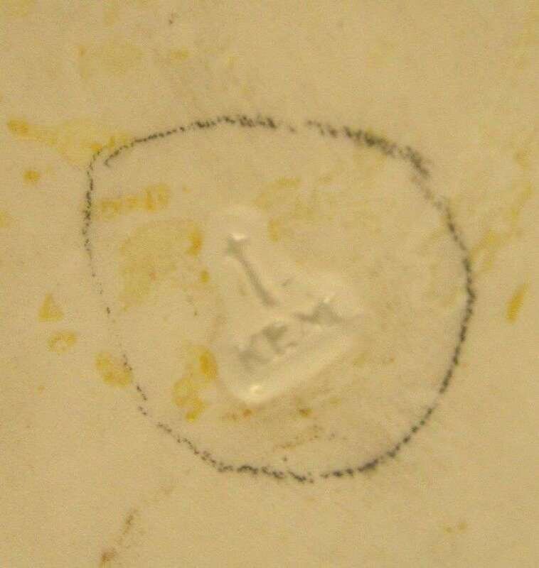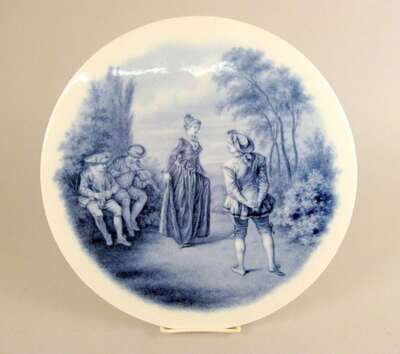 Circular, painted to show a dancing couple with musicians in 18th century dress in a natural landscape, impressed KPM and scepter mark.