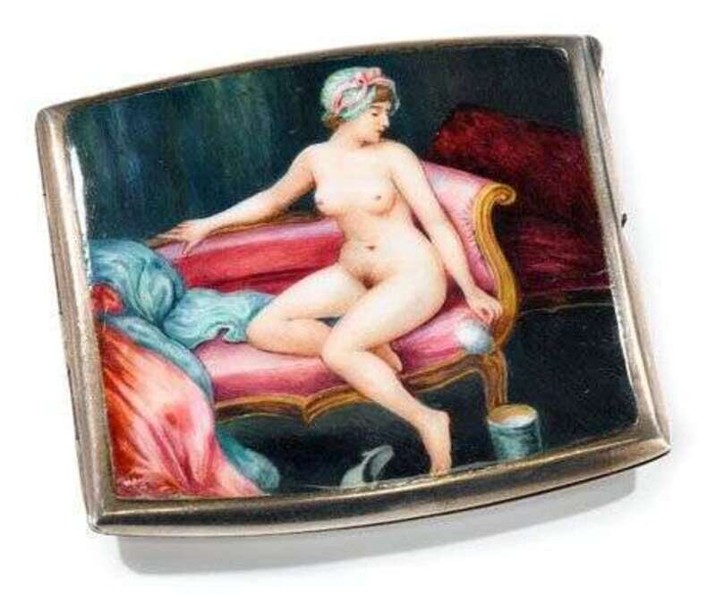 The shaped rectangular case depicting a nude young lady seated on a red sofa and holding a powder puff, with a gilt wash interior, stamped '935'.