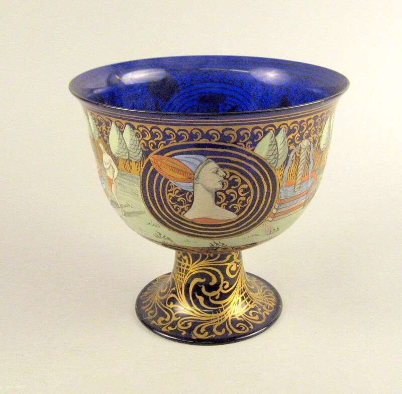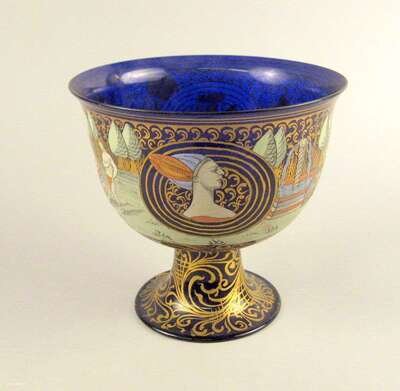 Painted with a continuous scene of bathers in a fountain and equestrian figures, divided by profile portrait reserves of a gentleman and a lady, on a spreading foot with gilt details.