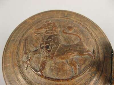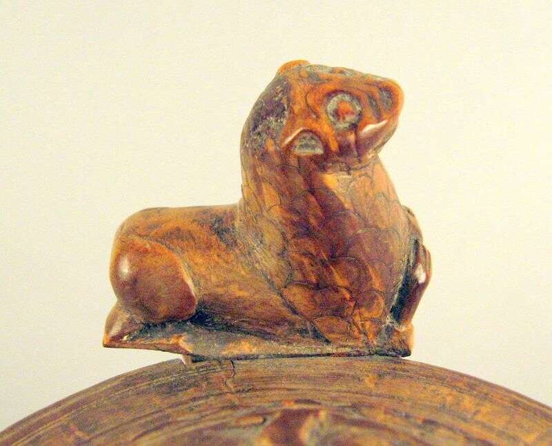 The hinged cover carved with a central medallion depicting a crowned lion, over a cylindrical body raised on three feet carved as dogs, the handle with a lion carved thumbpiece.