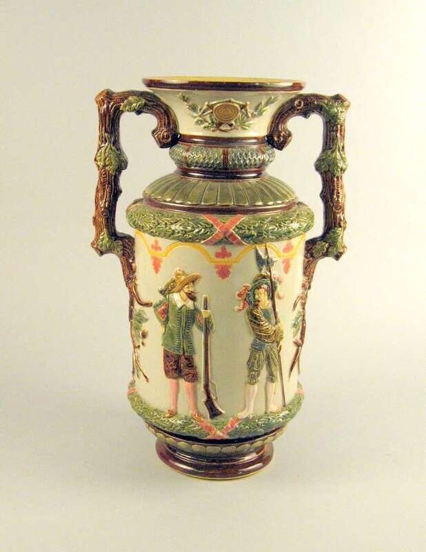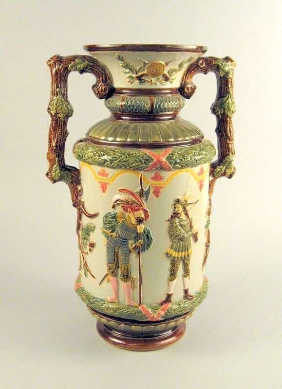 The flared mouth and banded neck over a cylindrical body molded with figures of 17th century men of arms between bands of ribbon-tied oak leaves, flanked by oak branch handles, unmarked.