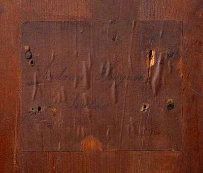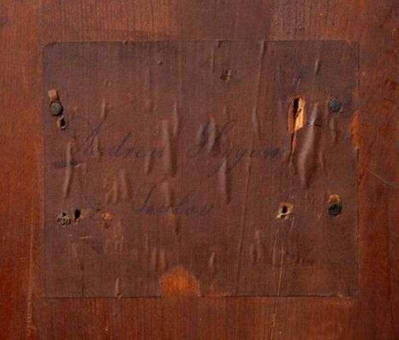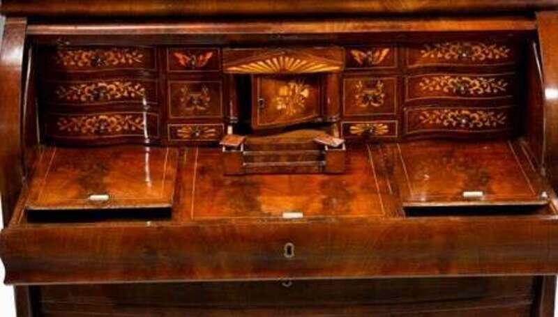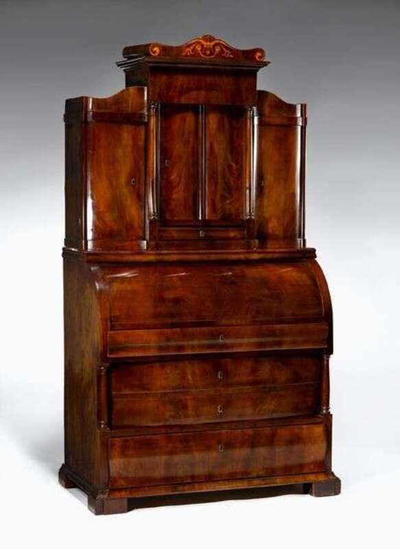 In two parts; the stepped upper section with a cupboard door above a frieze drawer, opening to a single drawer and flanking cupboard doors surmounted by a marquetry inlaid pediment; the lower section with a rolltop opening to two banks of three long drawers and two short drawers centered by a cupboard door within an architectural surround, the pediment and steps fitted as drawers, the steps flanked by a covered sandpot and inkpot, above a slide out writing surface fitted with three slides above two deep drawers raised on short block feet; the upper section with a paper label on the reverse inscribed 'Andreas Hygum, Taulou'.