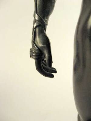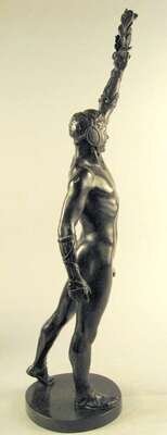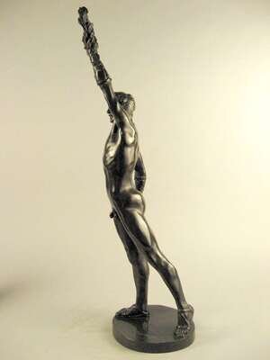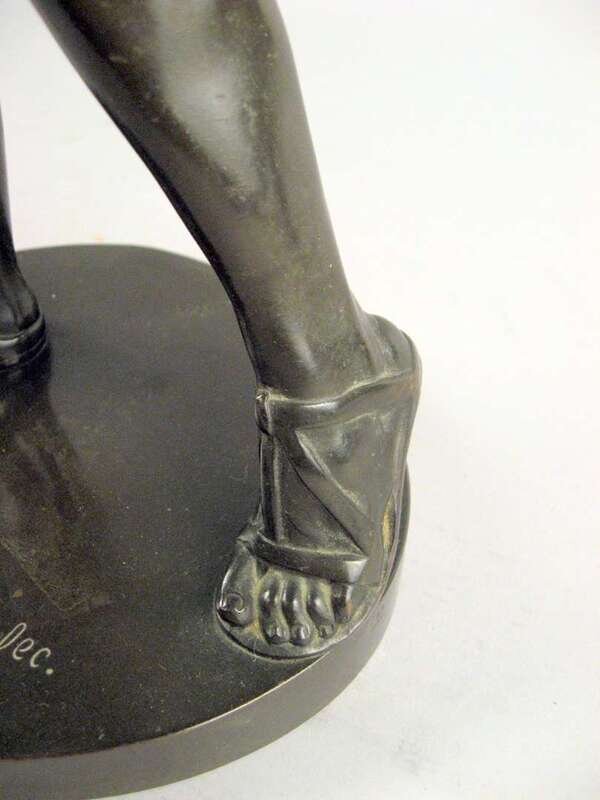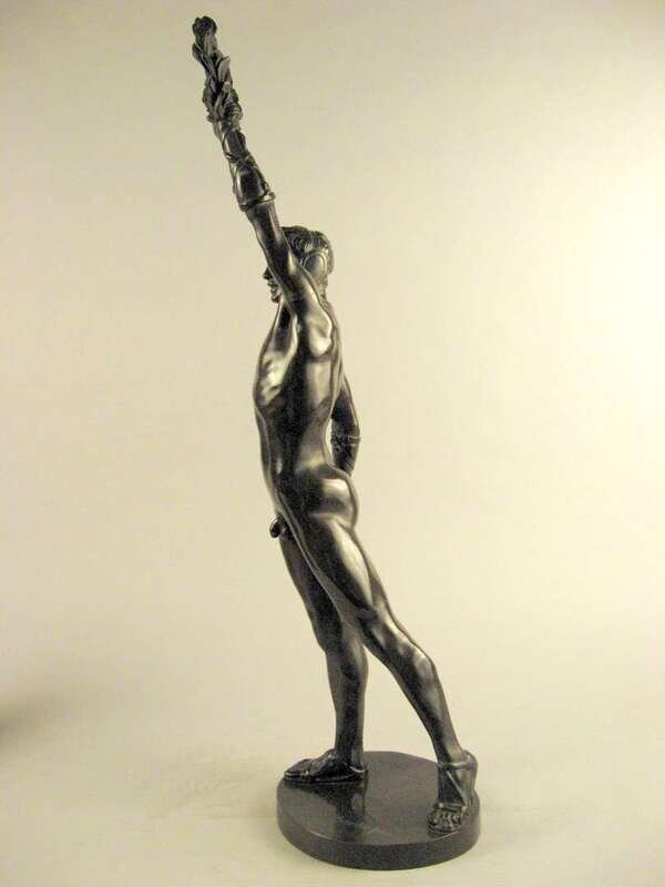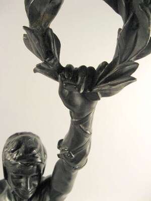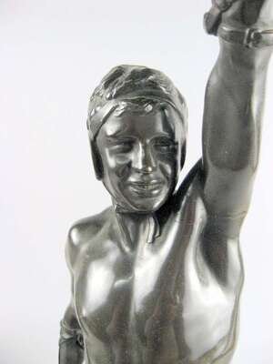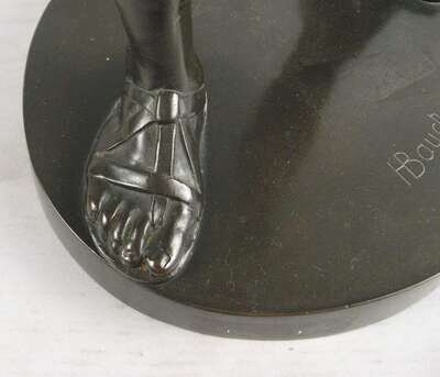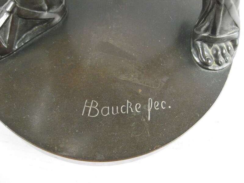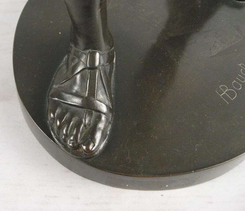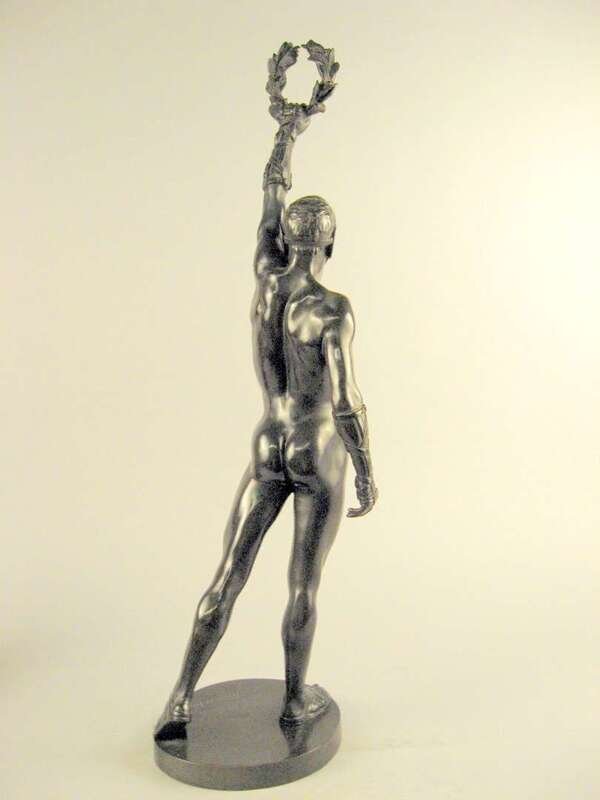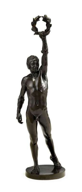 Bronze, dark brown patina, modeled as a classical male nude sportsman, his hand raised holding a wreath, inscribed 'H. Baucke Pec.', with foundry mark to the side.