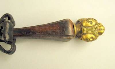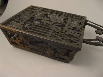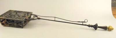 The walnut handle terminating in a brass knop cast with masks and with applied iron strapwork, the rectangular basket with a pierced gothic grille cover.