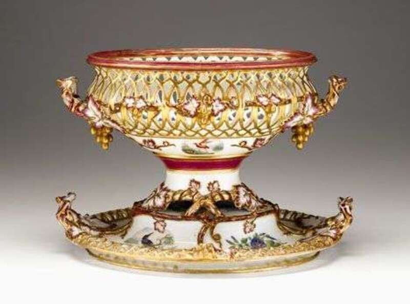 In two parts, the oval reticulated basket with molded grapevine handles and hung with grape clusters; the oval underplate with a raised central platform and a reticulated border with additional grapevine handles, both pieces painted with exotic birds and flowers, with puce and gilt details, unmarked.