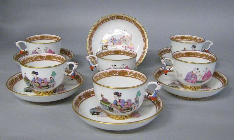 Painted with Chinese figures and symbols and gilt details, with figural handles, on a white ground, blue printed and impressed marks. (12).