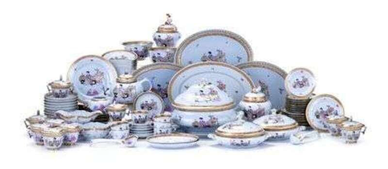 Comprising 12 dinner plates, 12 salad plates, 12 bread plates, 12 crescent shaped side plates, a large tureen, 2 covered vegetable dishes, 2 oblong side plates, a teapot with figural handle and spout, 2 covered sugar bowls with dolphin finials, 2 twin-handled sauce boats, 2 platters of graduated size, 3 oval trays, 2 serving bowls, 11 covered bouillon cups and saucers, a covered bouillon cup of smaller size, 6 teacups and saucers, a creamer, and 2 ladles; all painted with Chinese figures and symbols with gilt borders and details, some with pierced footrims, on a pale blue ground, blue printed and impressed marks. (105).