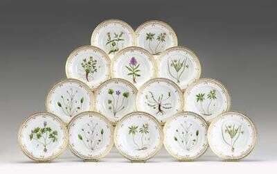 Each finely painted with botanical specimens, identified in Latin on the reverse, with gilt enhanced borders, shape no. 20 3537, standard printed and painted factory marks. (14).