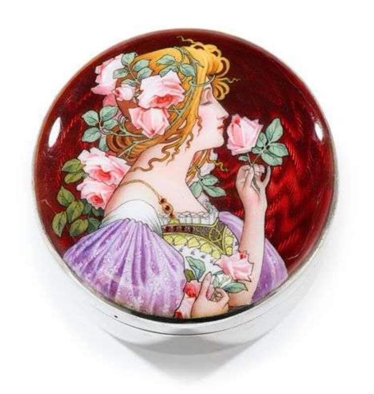 The circular silver box with a domed lid enameled with a profile portrait of an Art Nouveau beauty with roses in her hair and holding one to her nose, against a red guilloche enamel ground, makers mark HL.