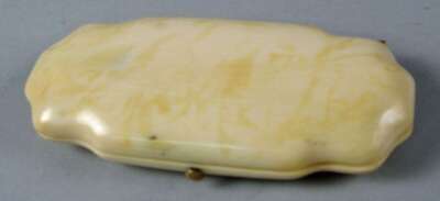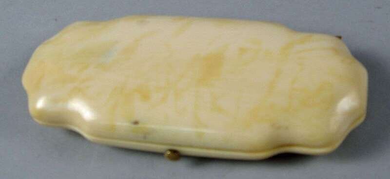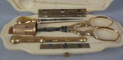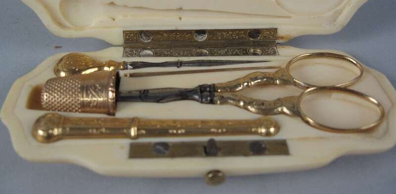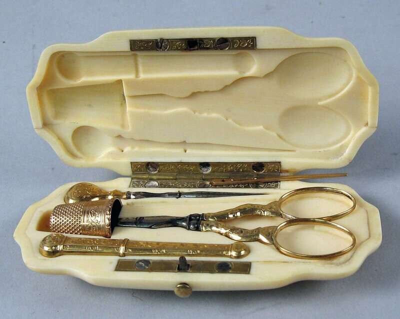 The shaped oval case containing a needle case, scissors, thimble, bodkin and stiletto, the thimble monogrammed 'JM'.