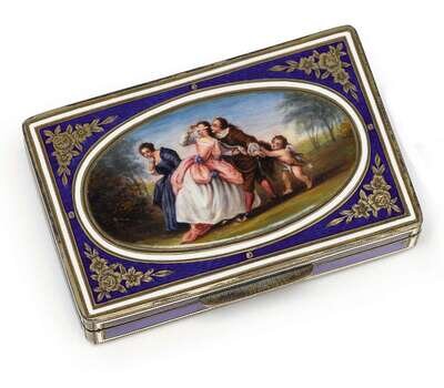 The rectangular hinged lid with an oval reserve painted with a scene of lovers' games in a landscape, against a cobalt enamel ground marked at the corners with silver floral sprays, with a gilt wash interior.