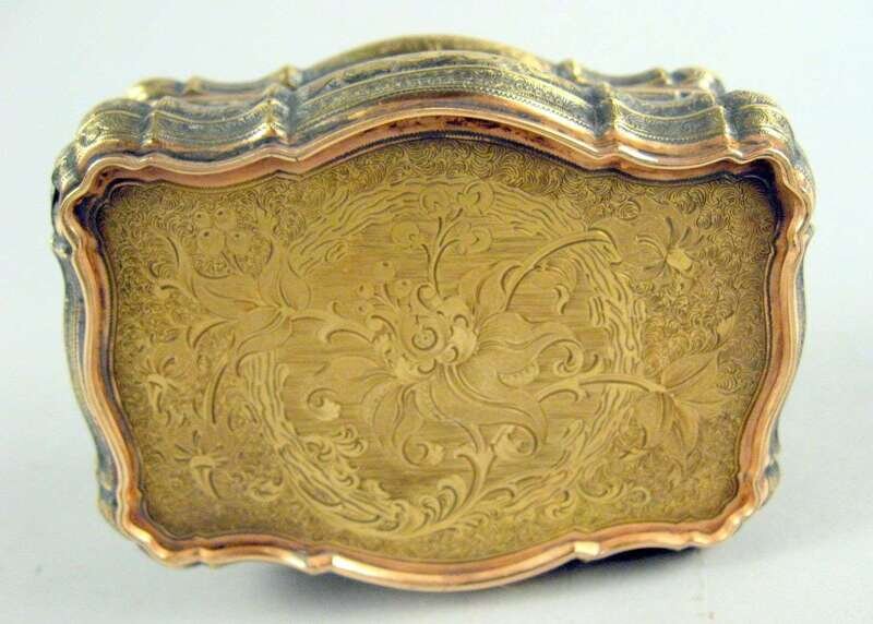 Of bombe serpentine outline, the cover centered by a diamond set monogram beneath a coronet and encircled by gold flowerheads, the sides and underside with chased floral motifs and opening to a rose gilt interior, stamped 1997 and incised no. 3618 to the rim.