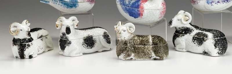 Each modeled as a recumbent ram with black sponged paint and gilt details to the horns, printed blue mark. (4).