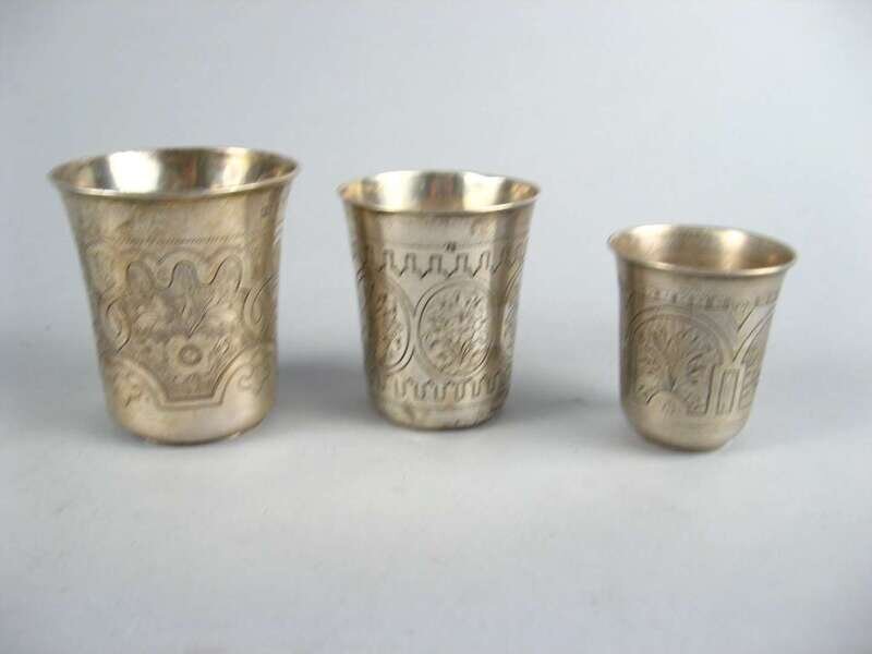 Three Russian silver vodka cups late 19th century, various makers