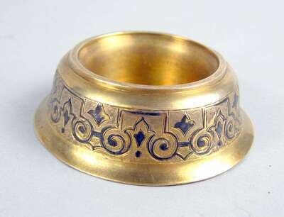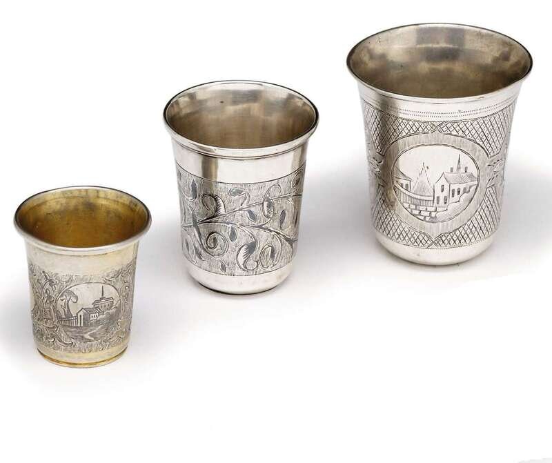 Comprising three vodka cups of varying size with engraved decoration, one silver gilt; and a silver gilt and niello circular salt. (4).