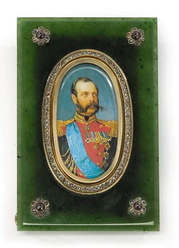 The rectangular frame mounted at the corners with silver and amethyst 'flowers', the central oval picture window encircled with a band of diamonds, the reverse with an ivory panel mounted with a scrolling gilt metal hinged support, stamped 84 standard with pseudo Faberge and maker's marks for August Holming, in a fitted red leather case.