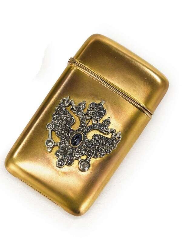 The gold case mounted with a double-headed imperial eagle set with diamonds and centered by a cabochon blue sapphire, with a match strike to the base, pseudo Faberge marks, maker's mark AT; in a fitted blue leather case.