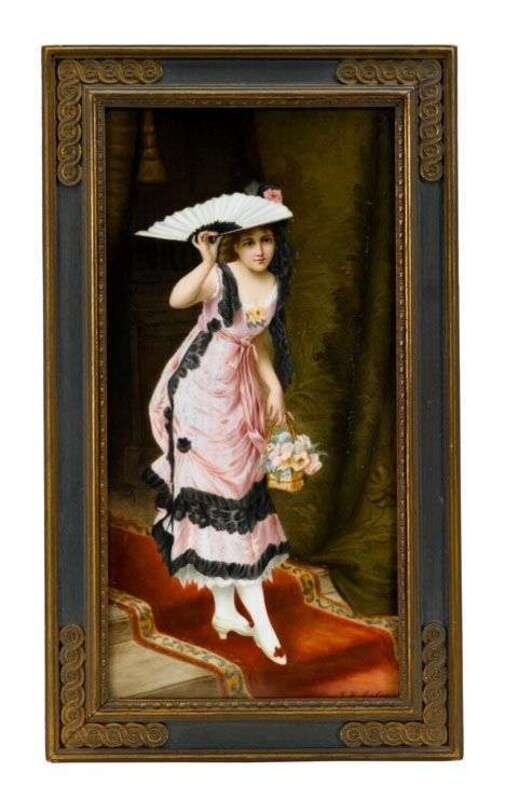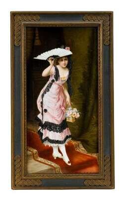 Depicting a young lady descending a stair holding a basket of flowers and shielding her head with a fan, signed G.H. Bishop, impressed KPM scepter and incised marks to reverse, framed.