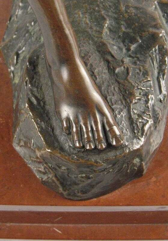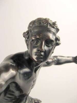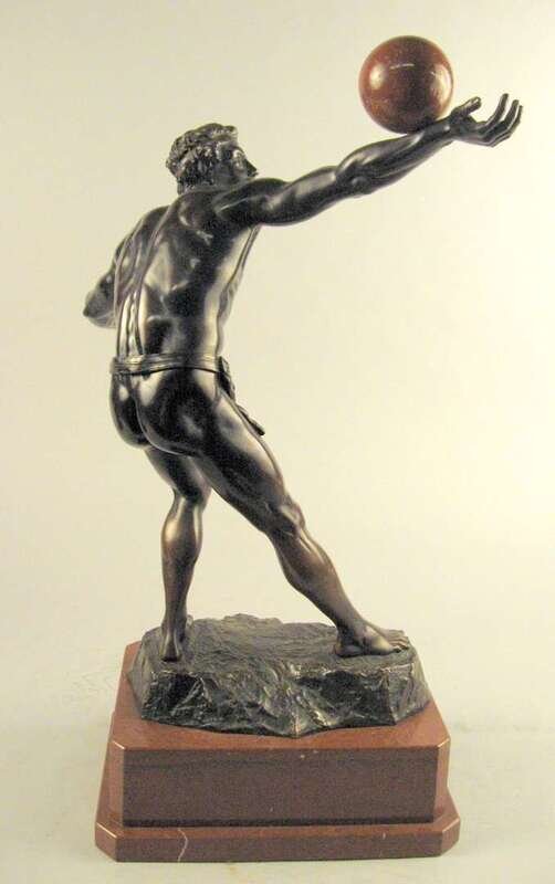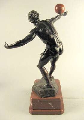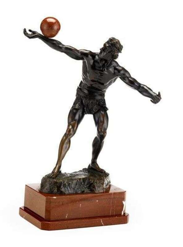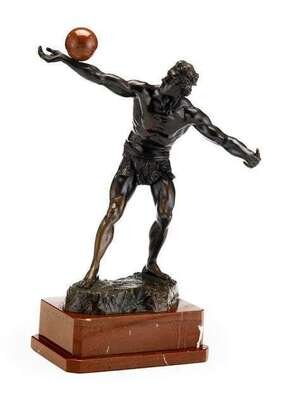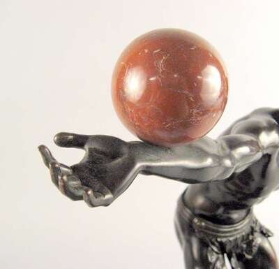 Bronze, dark brown patina, modeled as a classical figure balancing a rouge marble ball on his arm, raised on a stepped rectangular red marble base.