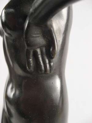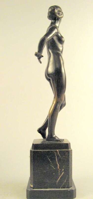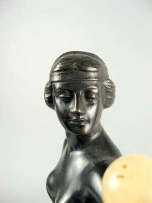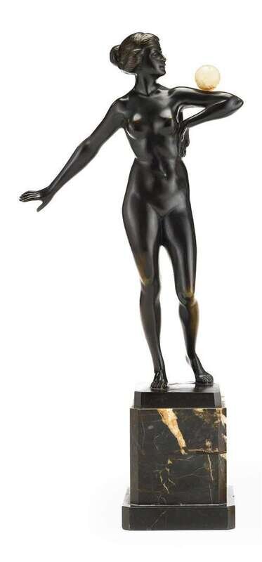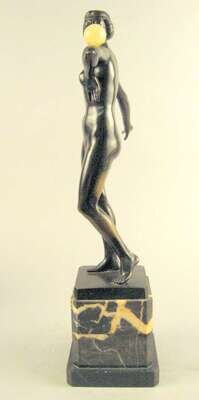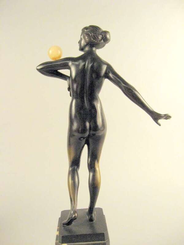 Bronze, dark brown patina, modeled as a standing nude balancing an onyx ball on her arm, raised on a black variegated rectangular marble base.