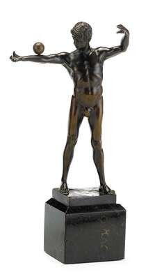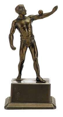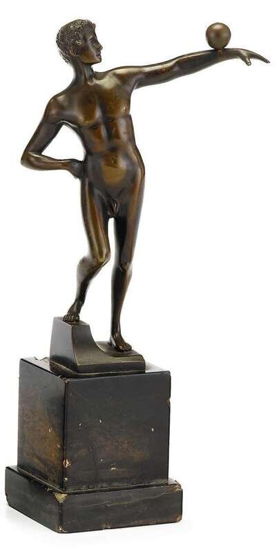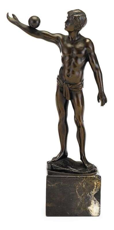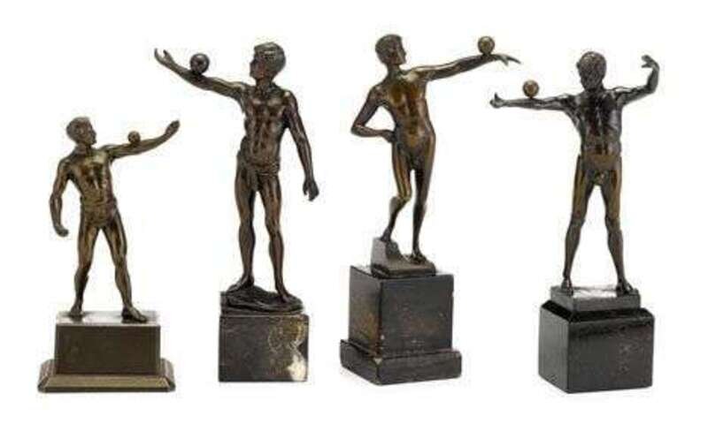 All modeled as semi--nude men balancing balls on their arms, the first German example signed 'V(ictor) Bugler' with foundry seal; the second German example signed (Ernst) 'Beck'; the third French example signed (Alfred) 'Moret' with foundry seal; together with a spelter figure of a similar subject. (4).