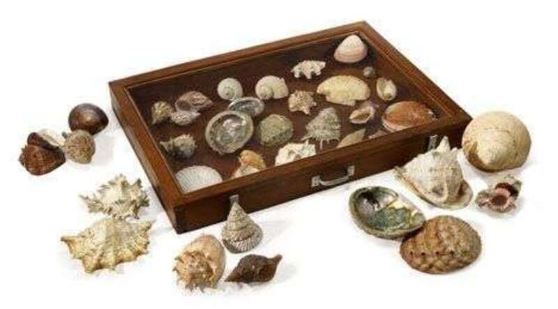 Large collection, some identified and labeled, including abalone, conch, cowrie, scallop, and other exotic species; together with a hinged display case.