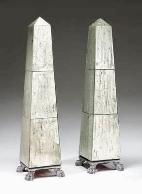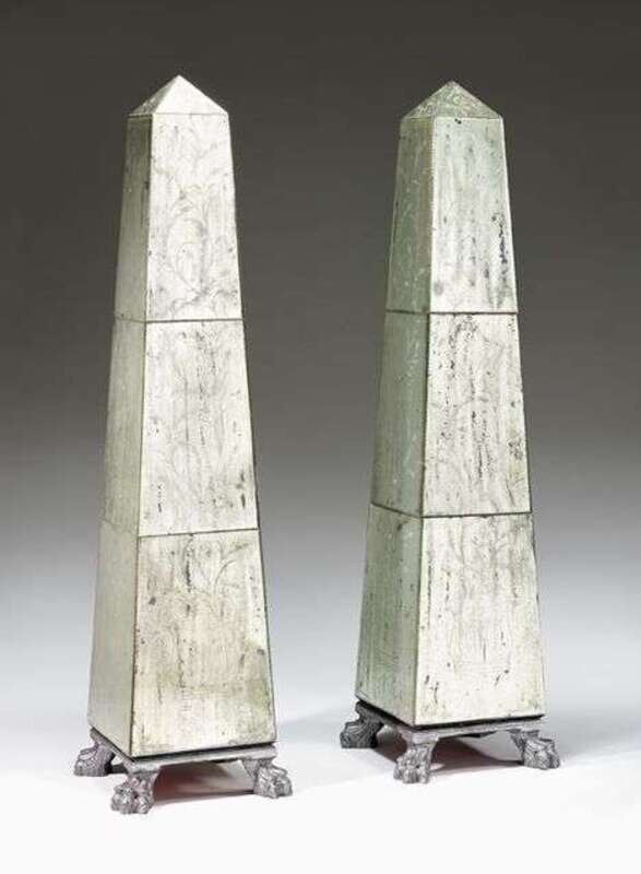 Each with mirror panel sides etched with scrolling trails, raised on silvered paw feet. (2).