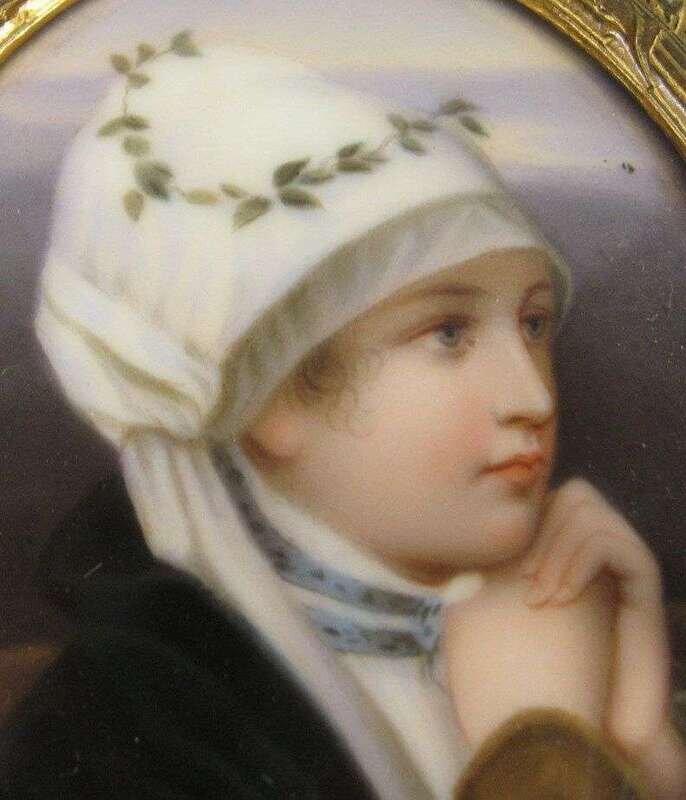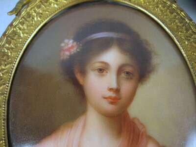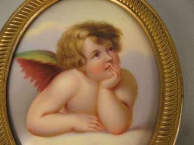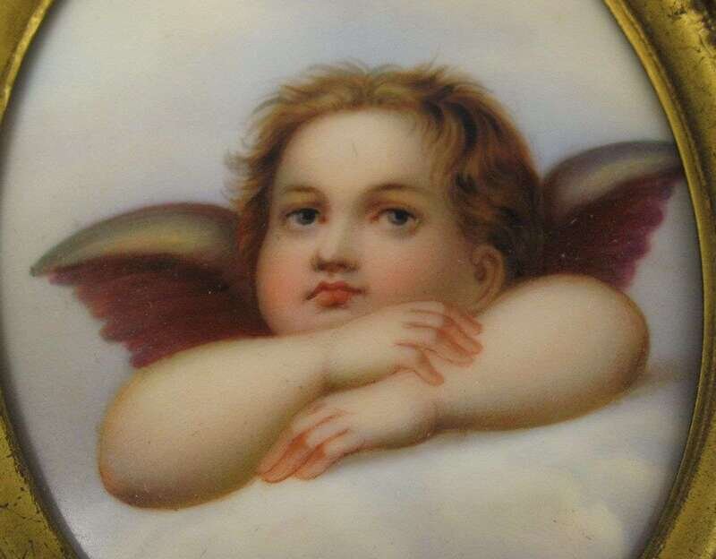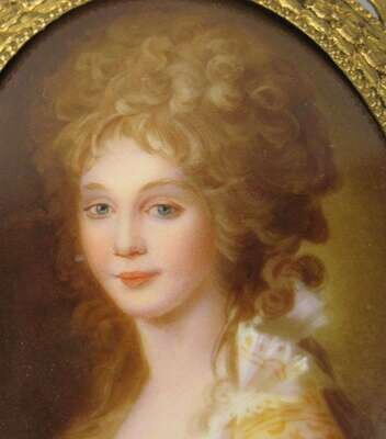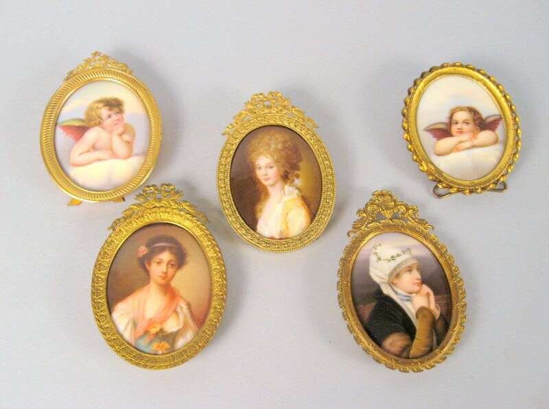 All oval, comprising two beauties in 18th century dress, a young lady with clasped hands, and a pair of cherubs after Raphael, all in gilt metal frames. (5).