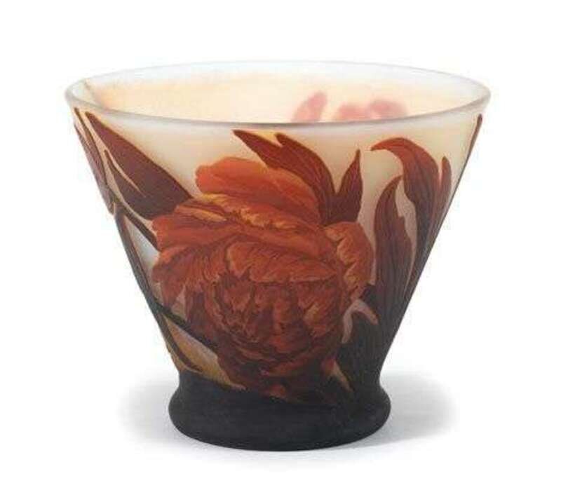Of trumpet form, decorated with orange peonies on a pale yellow ground, marked Muller Freres, Luneville.